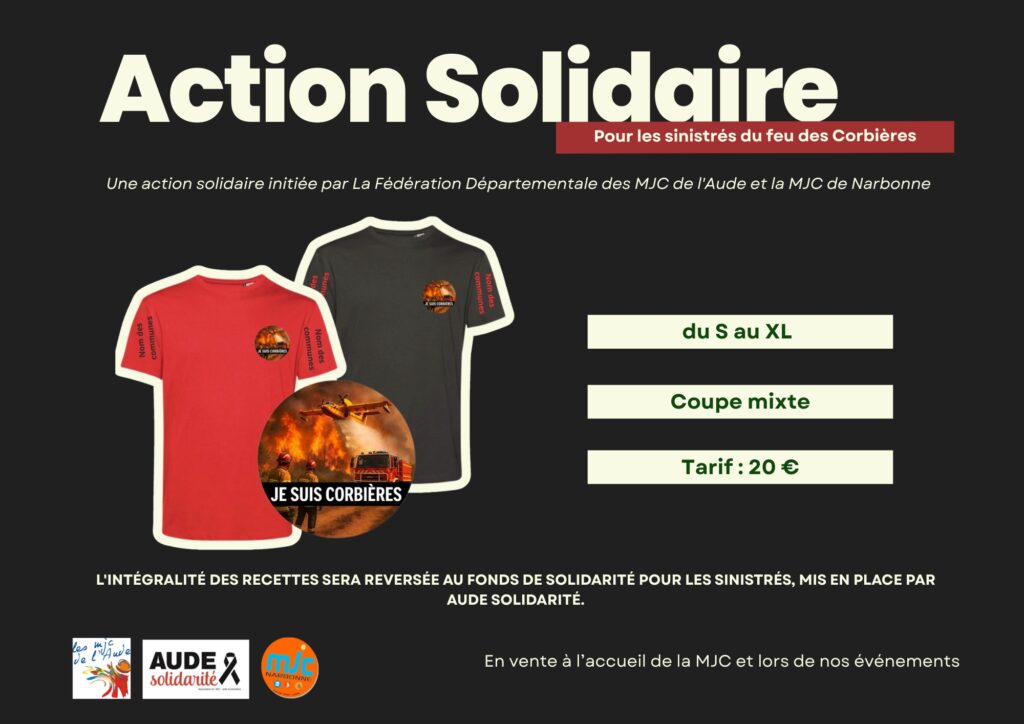 L’intégralité des recettes sera reversée à Aude Solidarité en charge du fonds de solidarité pour les sinistrés. Les t-shirts sont en vente à l’accueil de la MJC et lors de tous nos événements.
